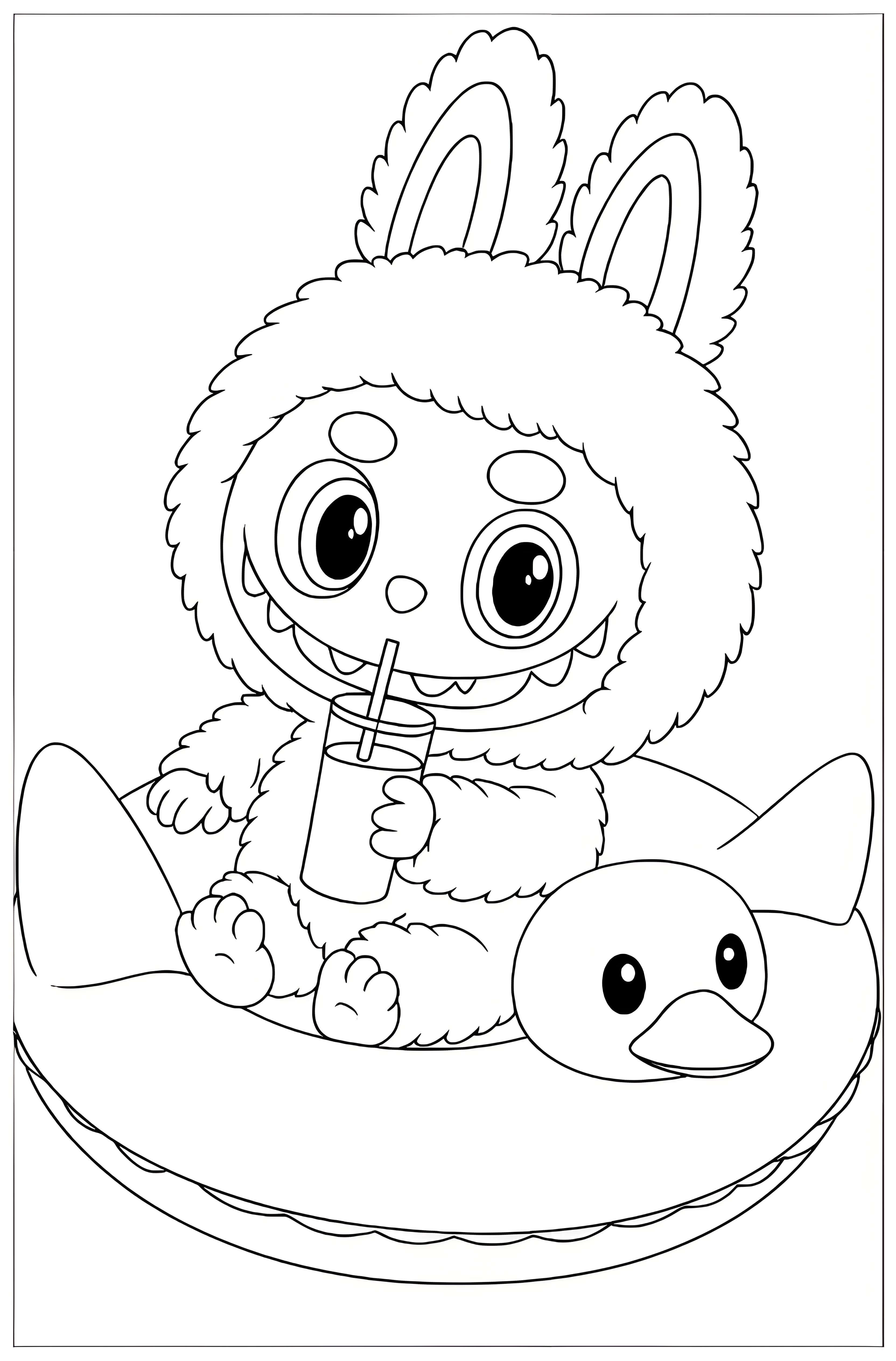 Stay hydrated and keep your hands clean with this fun coloring page featuring Labubu! This adorable creature with big, expressive eyes and fluffy ears is happily sipping water while sitting on a swimming ring. The simple background with a pool and a chair creates a peaceful scene, perfect for coloring fun and keeping kids hydrated. Labubu’s charming look and active expression make this page a delightful addition to any coloring project, inviting children to express themselves through their favorite colors!