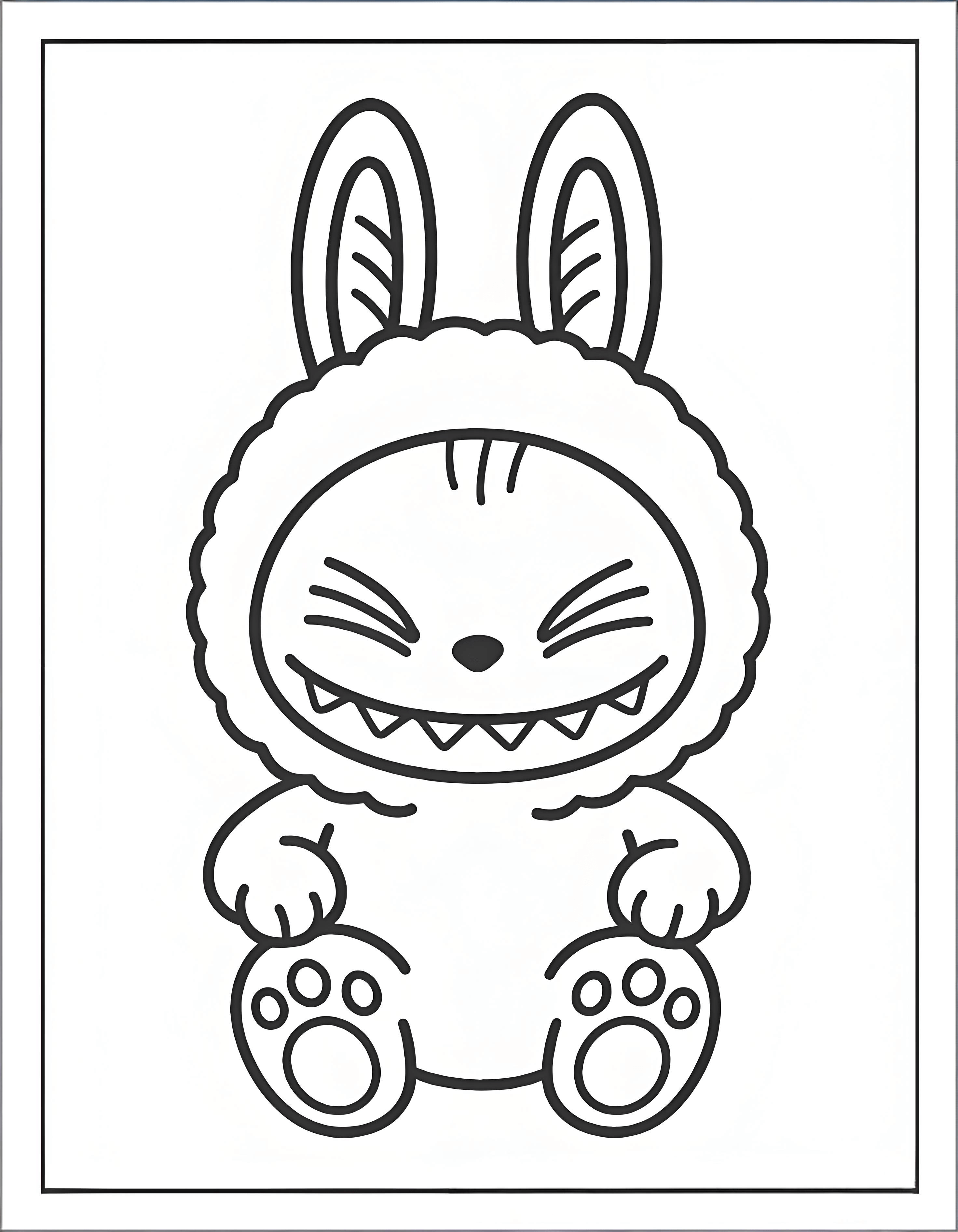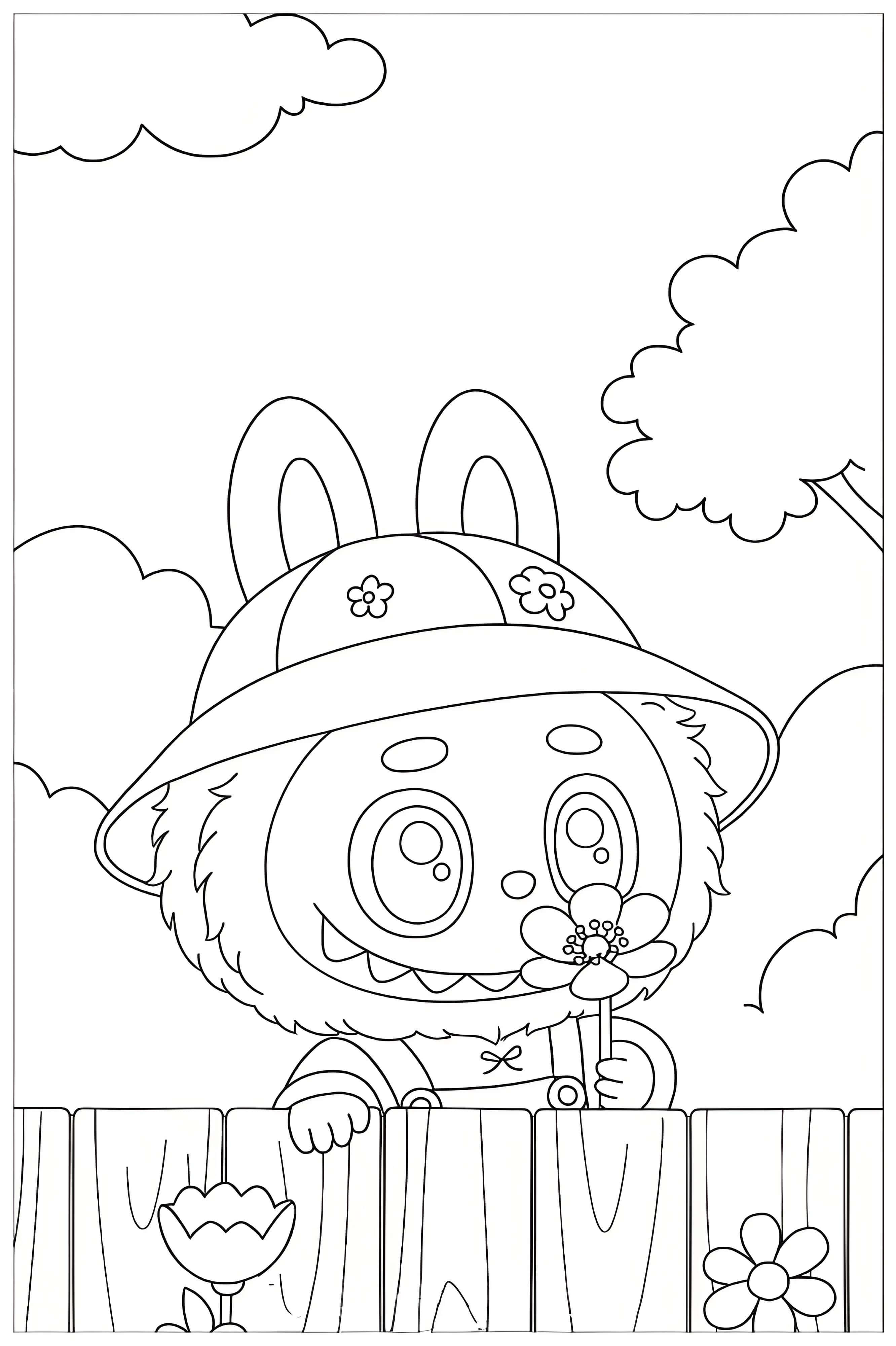 This image features a playful character named Labubu. Labubu has a cute and friendly appearance, adorned with fuzzy bunny ears and a fluffy hood. It displays a joyful expression, with big, round eyes and a mischievous smile. The character's outfit includes a checkered bib that adds a fun design element. A small flower is visible near its hand, enhancing its cheerful look. Labubu's vibrant personality is showcased in this coloring page, making it an enjoyable subject for children to color.