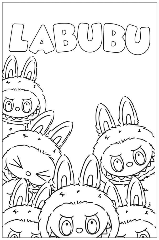 This coloring page features a fun and lively illustration of the Labubu family, a group of cute and quirky bunny-like characters. Each character has distinct expressions, showcasing a range of emotions from cheerful to mischievous. The Labubu characters are designed with fluffy fur, long ears, and playful features that make them delightful to color. The bold letters spelling 'LABUBU' at the top add a playful touch to the scene, inviting creativity. The overall composition encourages kids to engage with their imagination as they bring these charming figures to life.