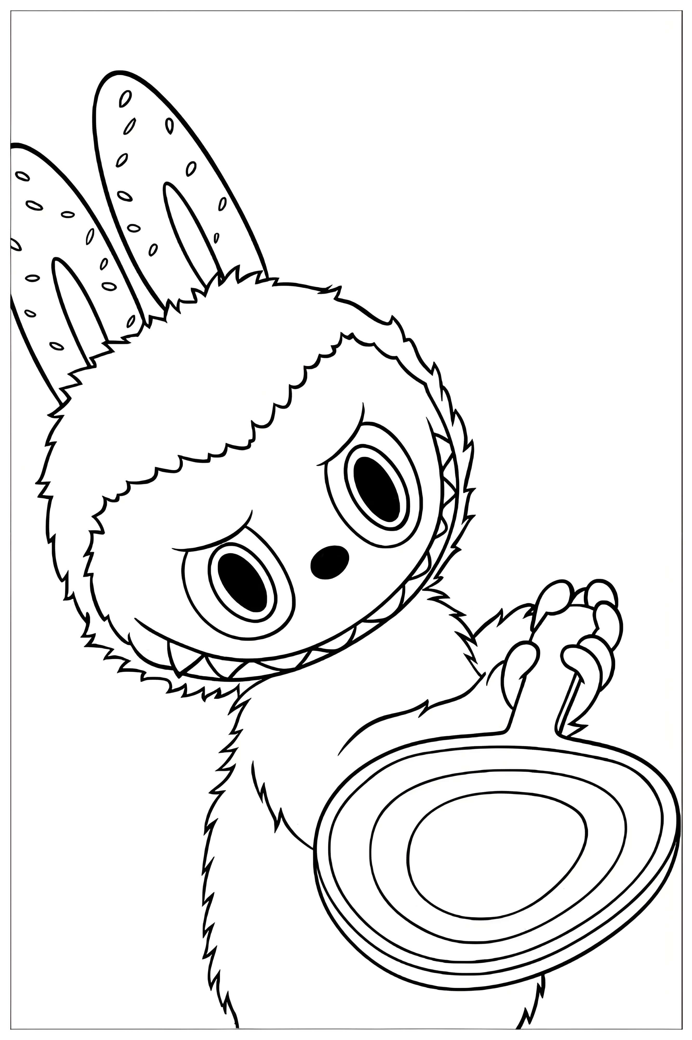 Get ready for a fun coloring page featuring Labubu! This adorable creature with big, expressive eyes and fluffy ears is holding a racket, complete with a fun cap that reads 'THE MONSTERS LABUBU'. Labubu’s colorful, fuzzy outfit makes the character visually striking, while the lively background—complete with trees and a chair—creates a cheerful setting. This engaging drawing invites kids to unleash their creativity and imagination, bringing Labubu to life with their favorite colors!