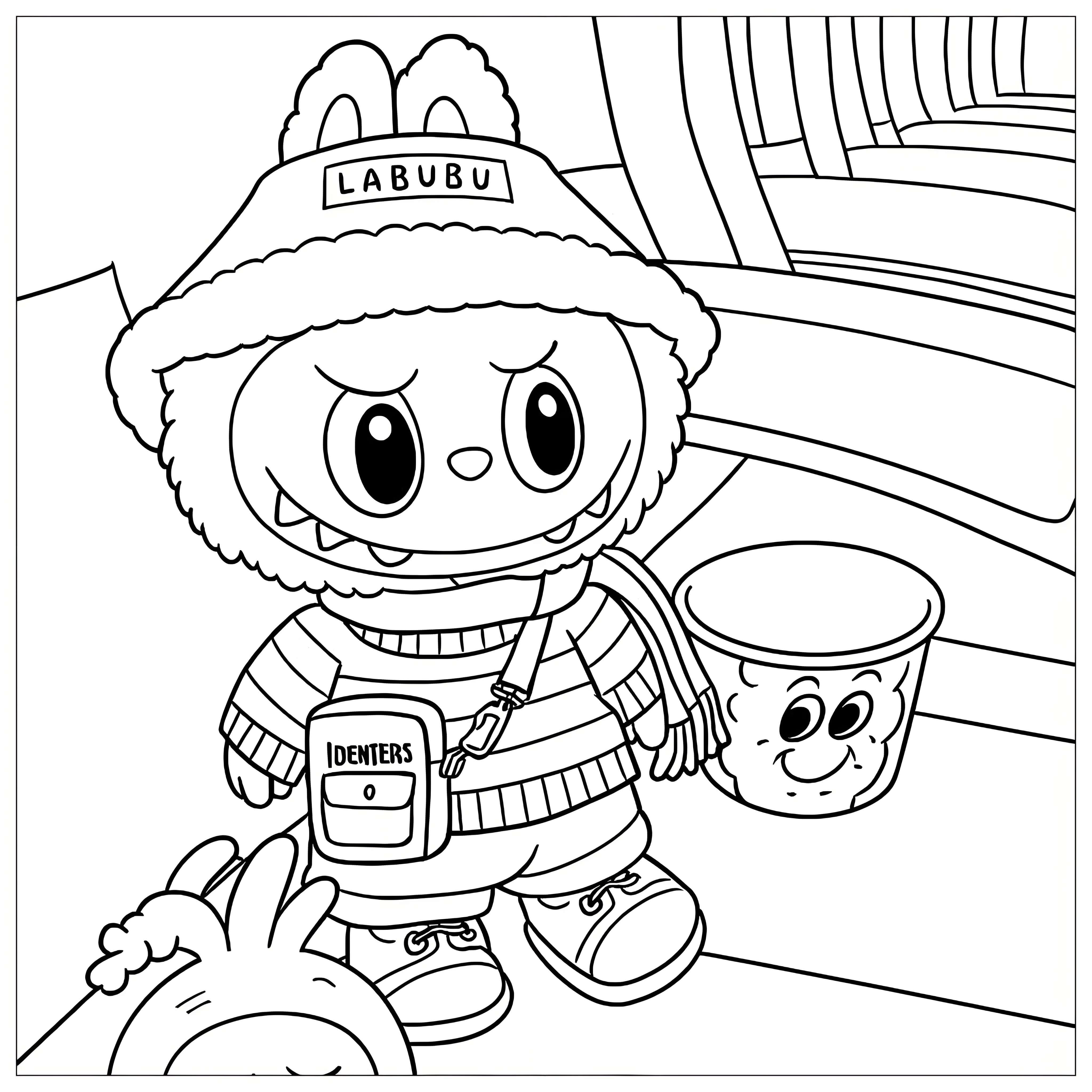 This delightful coloring page features Labubu, an adorable character waiting for a train at the station. With his fluffy ears, big expressive eyes, and friendly smile, Labubu is sure to charm young artists. He's warmly dressed in a striped sweater and a cozy hat with 'LABUBU' embroidered on it. Next to him sits a cheerful bucket with a smiling face, adding extra joy to the scene. In the background, the station's curved design frames the train tracks, creating a lively setting. This fun and exciting scene is perfect for sparking creativity in kids!
