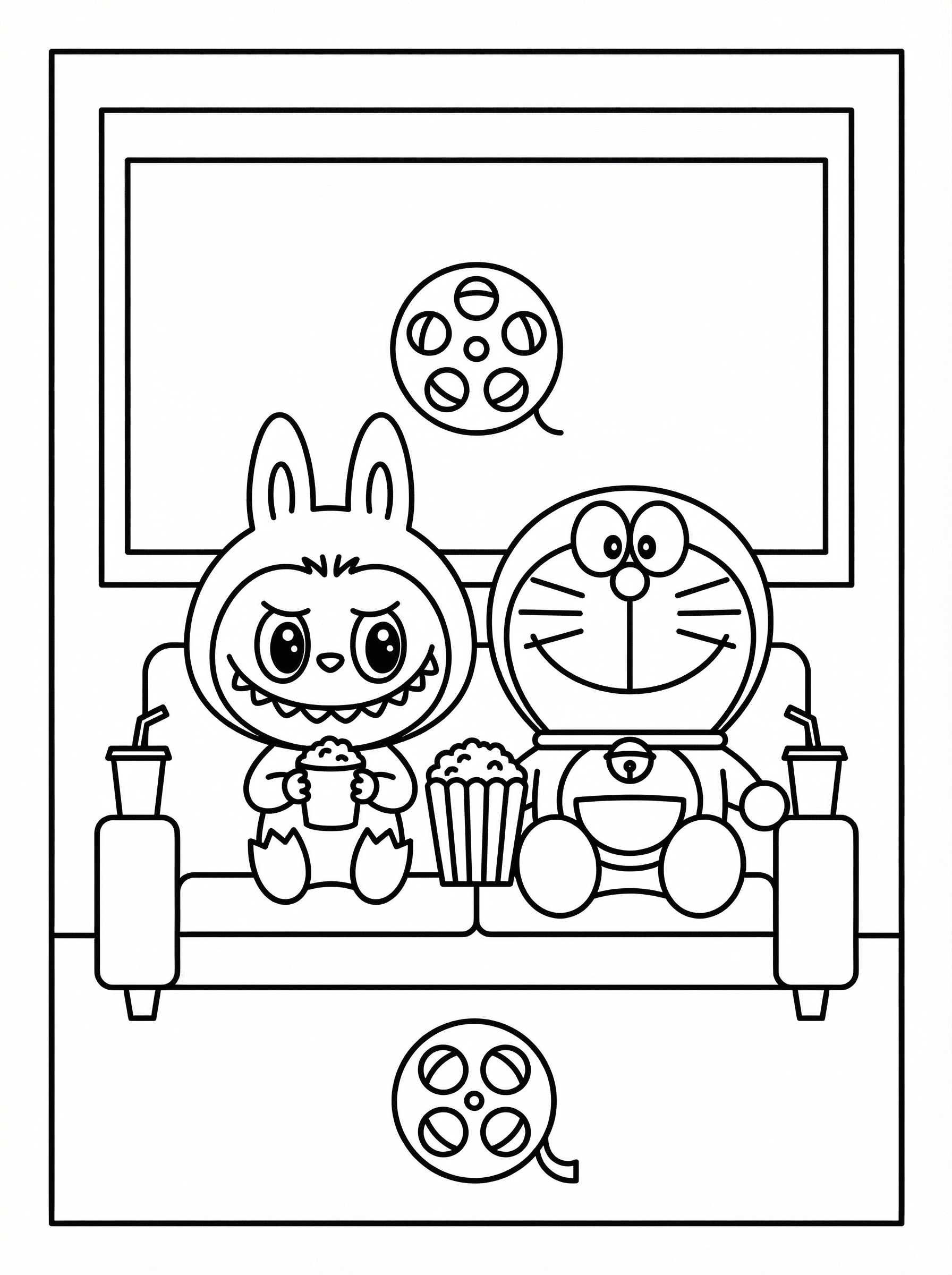 Download this free Labubu And Doraemon Watch A Movie Together coloring sheet, print at home, perfect for kids ages 3-8.Download free, share with friends!#labubu coloring pages、#free printable、#kids activity